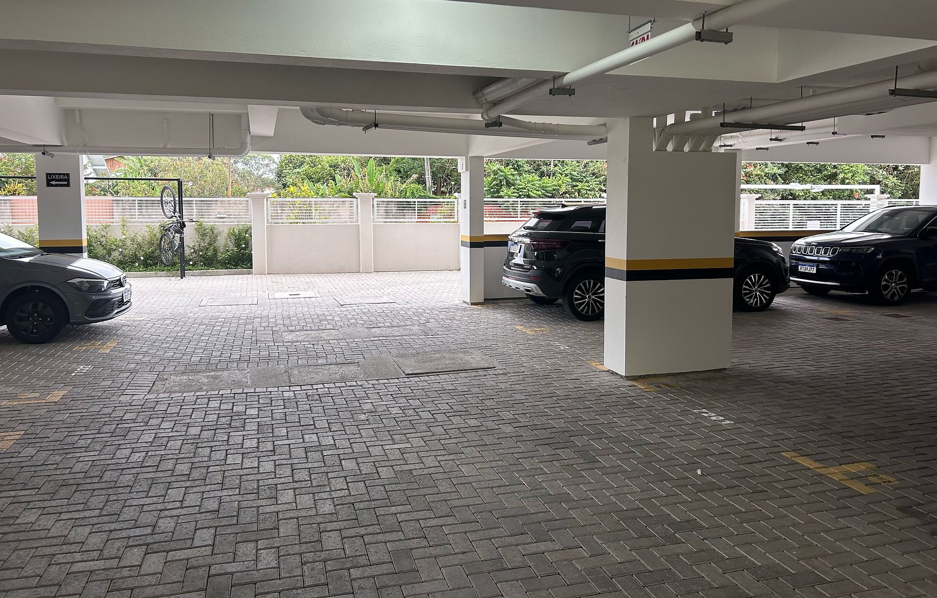 5) As vagas de garagem comportam veículos de até 5 metros de comprimento. O veículo deve permanecer dentro das marcações amarelas pintadas no chão.